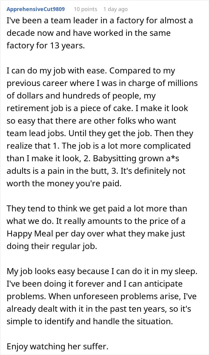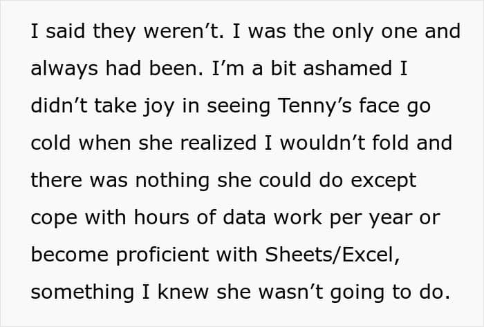 The author deserves credit for handling the situation the way she did. She let karma do its thing, and it did deliver. It also likely taught Tenny a valuable lesson on sabotaging others for her own gain, and she would be dealing with the fallout for a while.