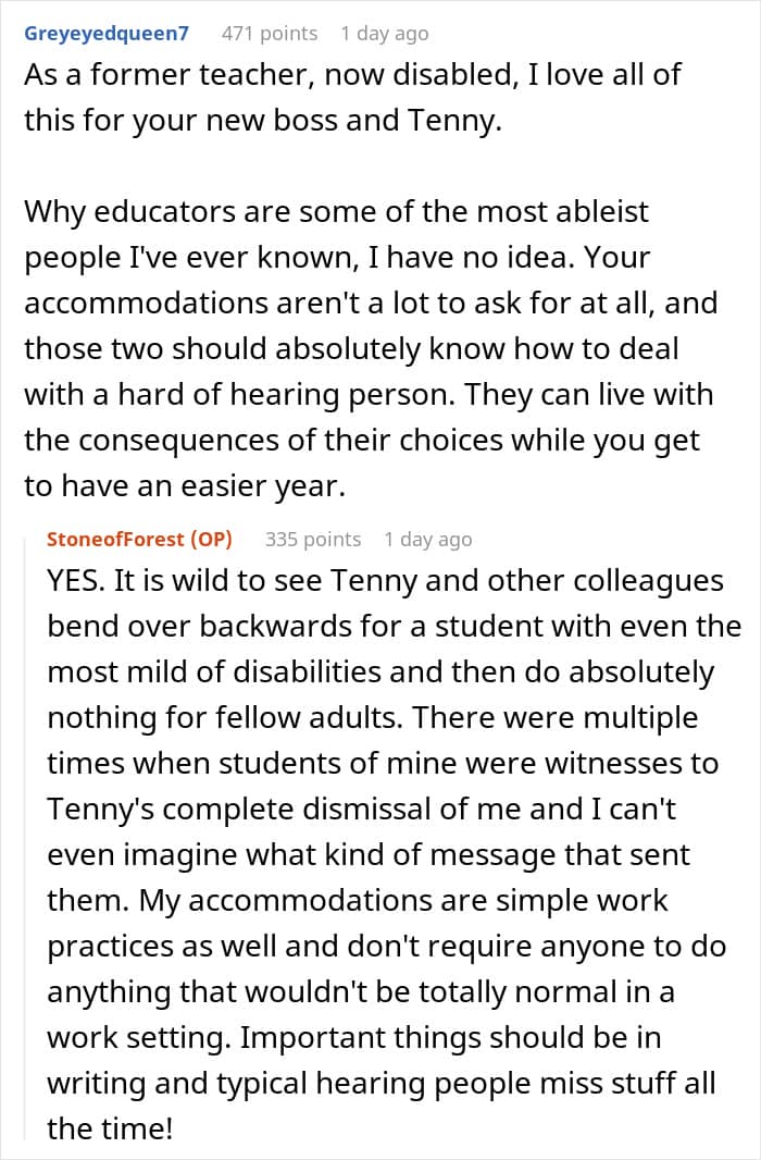 A teacher experienced this with one of her colleagues, who took advantage of her hearing disorder