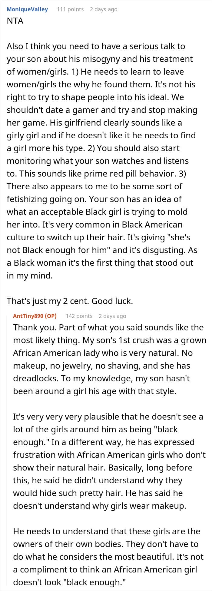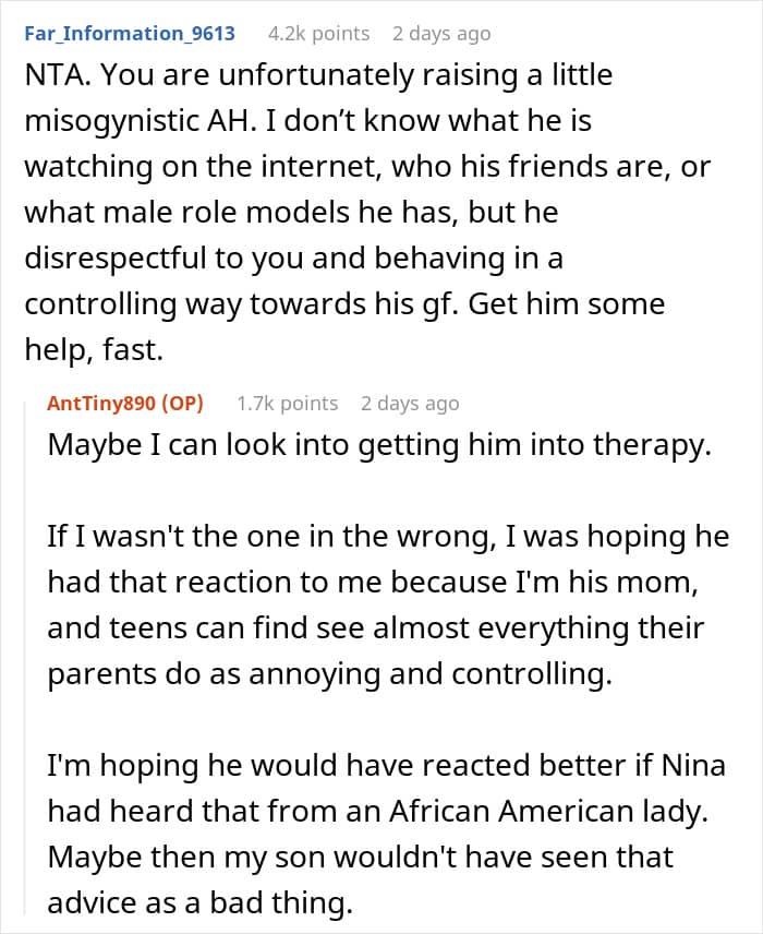 Unfortunately, the story doesn’t end here. Days after this conversation, the woman’s son came up to her, all angry, and started lecturing her on advising black girls about their looks. He even called her an overbearing mom and a Karen. This made the woman wonder – maybe she really crossed a line?