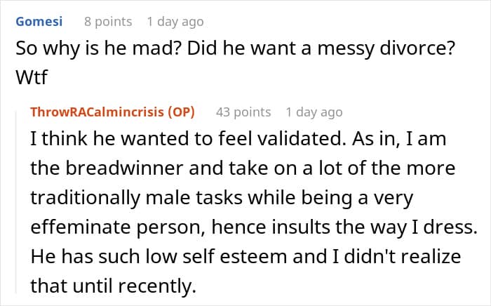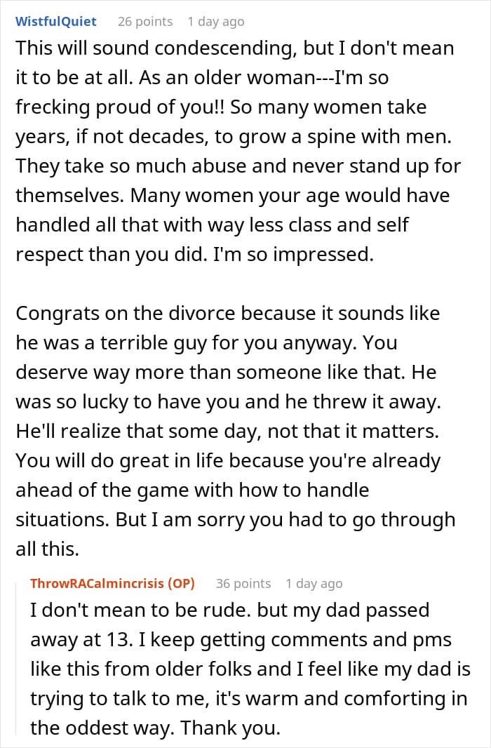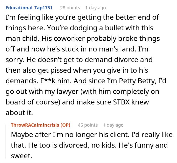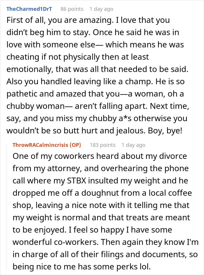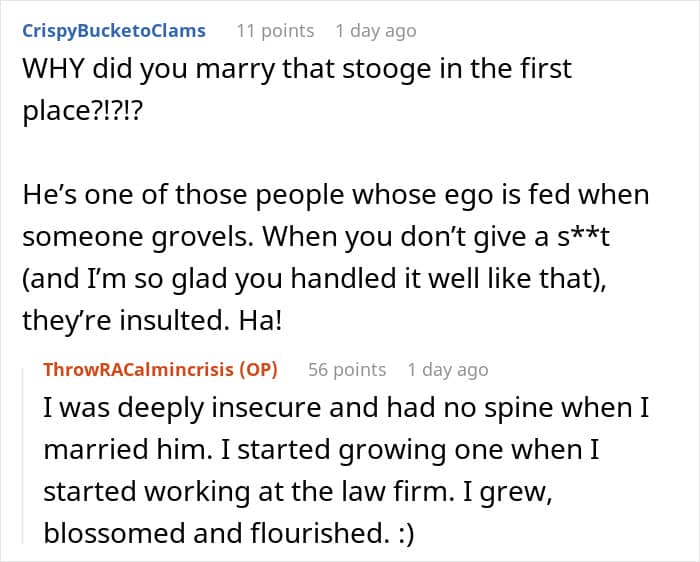 The commenters were very supportive of the OP, complimenting her for her actions and bashing her husband for being a man-child. The poster was quite active with the responses, too, and she shared about how she grew her confidence and theorized that her soon-to-be ex was most likely jealous of her attorney for being everything that he’s not.