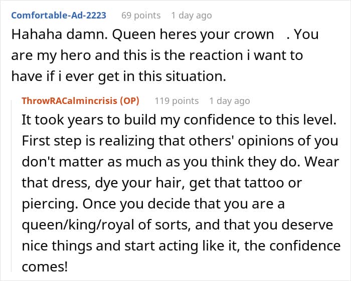 The commenters supported the woman, complimenting her for her confidence and bashing the husband for his child-like behavior