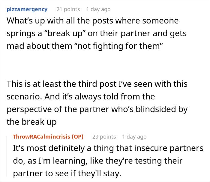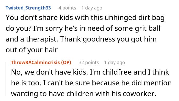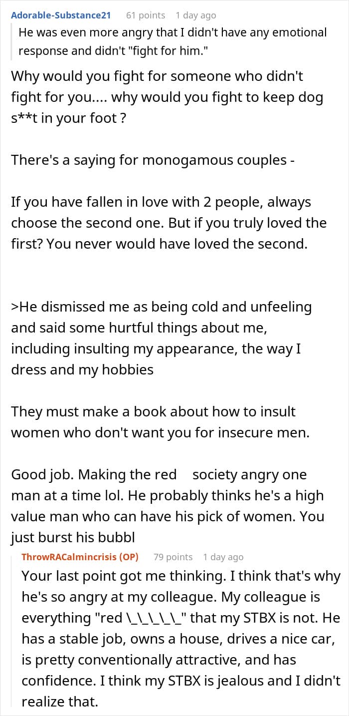 A couple of weeks later, the husband contacted the OP, livid about the woman moving out and, more importantly, about her not showing much of an emotional response or “fighting for him.” When she explained to him that she takes time to process things, he started throwing insults, calling her cold, unfeeling, and other things.