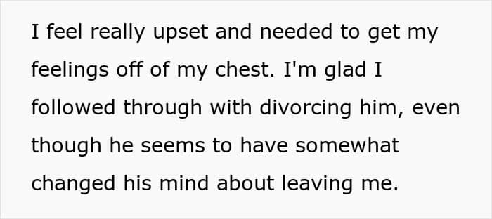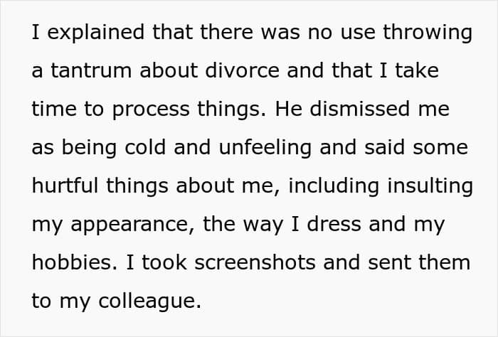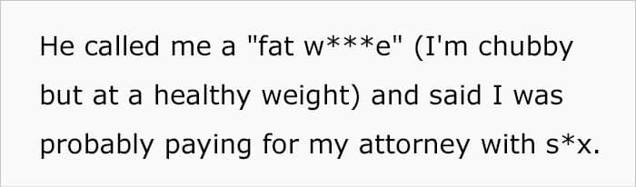 Things only got worse when, some days later, the soon-to-be ex-couple had their first hearing, and the man flipped out after seeing that the poster had chosen her colleague to represent her. He began accusing the wife of sleeping with her attorney, and when she denied the claims, he proceeded to further insult her, digging his hole even deeper.