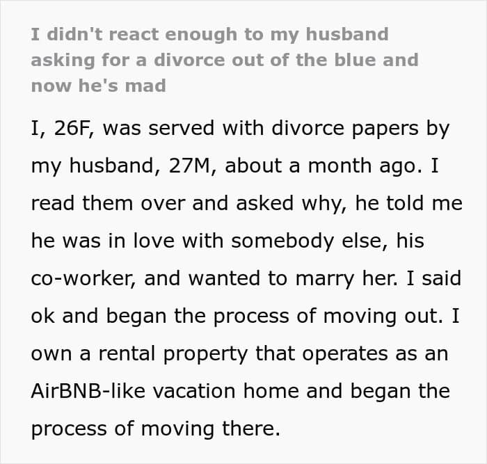 A great example of this is a story that one Redditor recently shared online. The woman was approached by her husband, who told her that he loves someone else and wants a divorce. Yet, when the woman took it very calmly and agreed to his request, he was the one to flip out and start calling her names. Scroll down to read the full story!