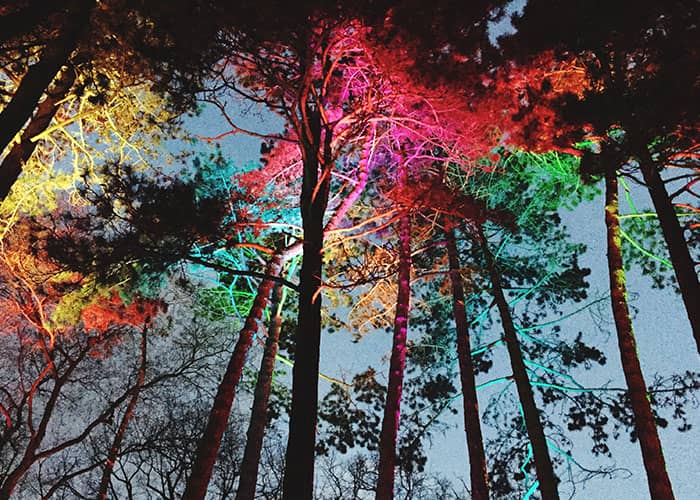 Was driving through rural Scotland one night going down a country lane, all off a sudden I start to see flashing lights come through the trees. Lights of all colours flashing through the trees and causing some really freaky looking shadows on the road.
