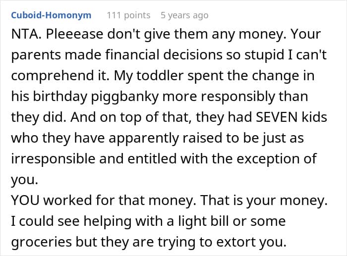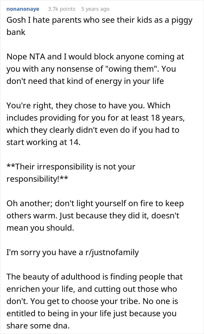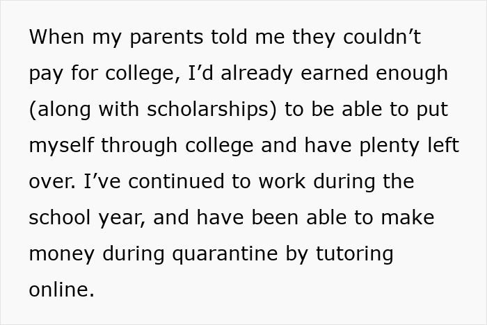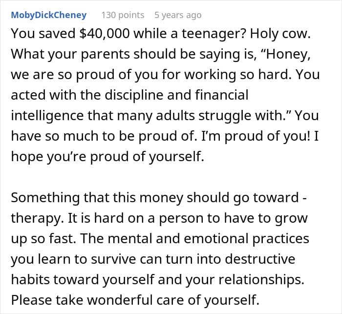 One Redditor knew this early on and decided to prepare for her future. She started working at 14, juggling jobs until she managed to save $40K by the age of 19 to pay for college. But instead of celebrating her determination, her parents stunned her with a demand: they wanted every penny, claiming she owed them the money for raising her.