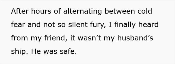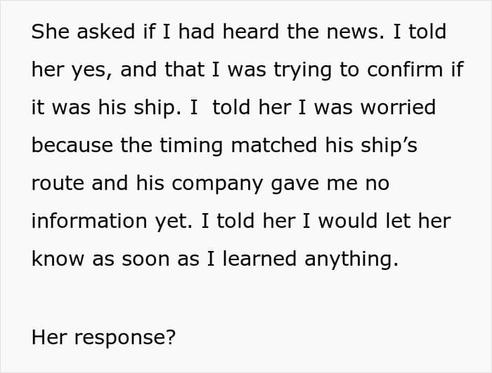The timing and location perfectly matched her marine husband’s route. The OP, who panicked and worried about her husband’s life, started frantically calling anyone who would be able to provide answers. The company? Tight-lipped. A friend whose husband was also on board? No help.