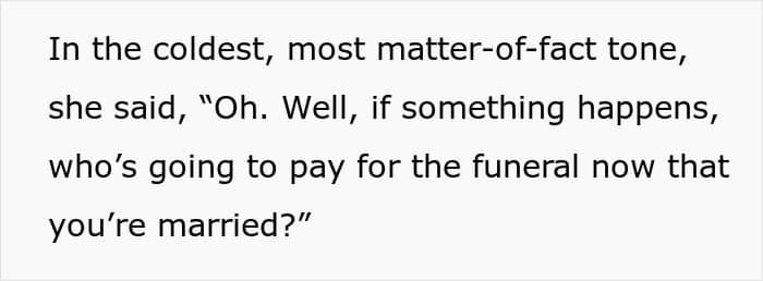 But instead of concern or comfort, she dropped a question so cold it would give Antarctica frostbite: “If something happens, who’s going to pay for the funeral now that you’re married?” Yep, it was all about money. No “Are you okay?”, no “Let’s hope he’s safe”—just straight-up funeral financing. Let that sink in.