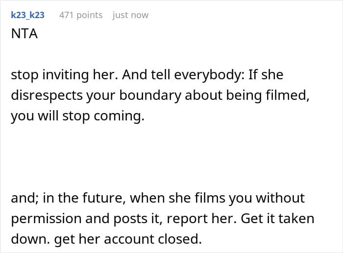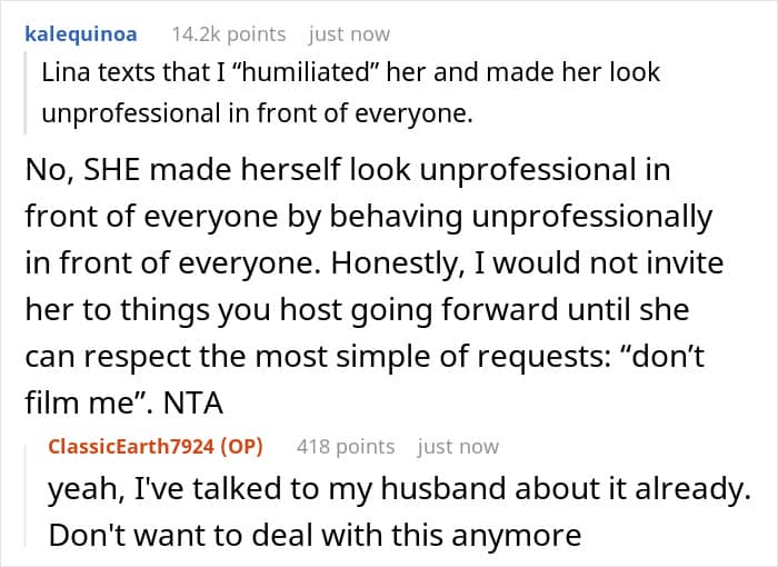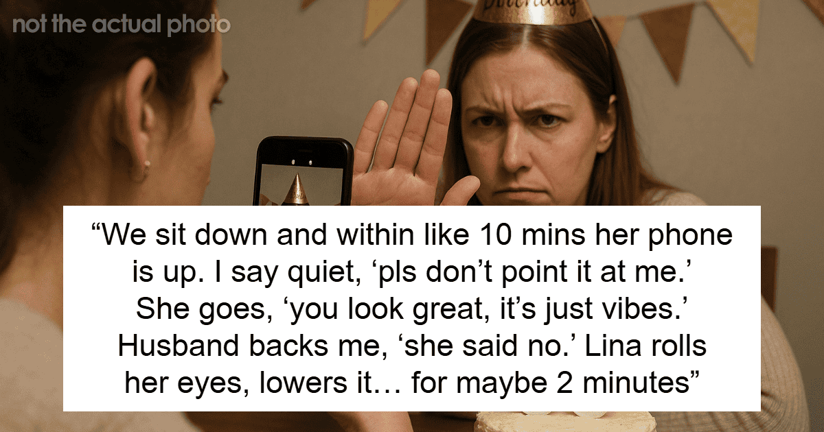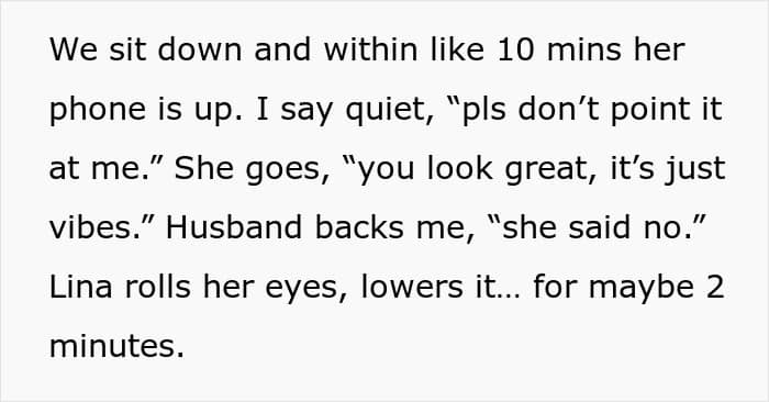 That’s when the OP placed her hand over the camera lens. No grabbing, no smashing, just a polite “not today, sweetheart.” Lina was furious, accusing the OP of ruining her shot and humiliating her in front of everyone. Even her mother-in-law said she should have “just let it go for one night,” as if personal boundaries expire.