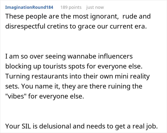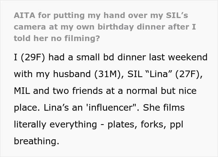 The OP (original poster) had organized a simple, cozy dinner at a nice little restaurant with her husband, a couple of friends, her mother-in-law, and her sister-in-law, Lina, the “influencer.” Now, Lina has a reputation – she films everything. Forks, plates, people breathing, nothing is safe from her phone’s camera lens.