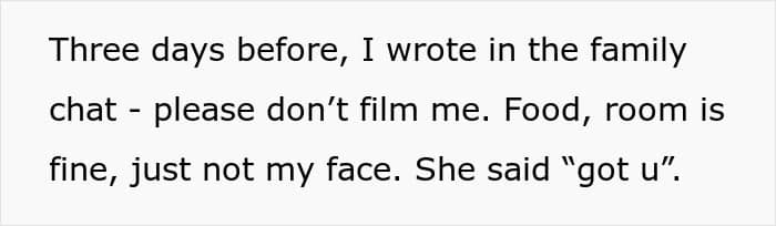 But the OP is not a fan of having her face plastered all over the internet, so she made it clear in the family group chat before the dinner that she didn’t want to be filmed. Food shots? Sure. Cute restaurant vibes? Go for it. But her face? Hard pass. Lina replied with a cheerful “got u,” and that was that.
