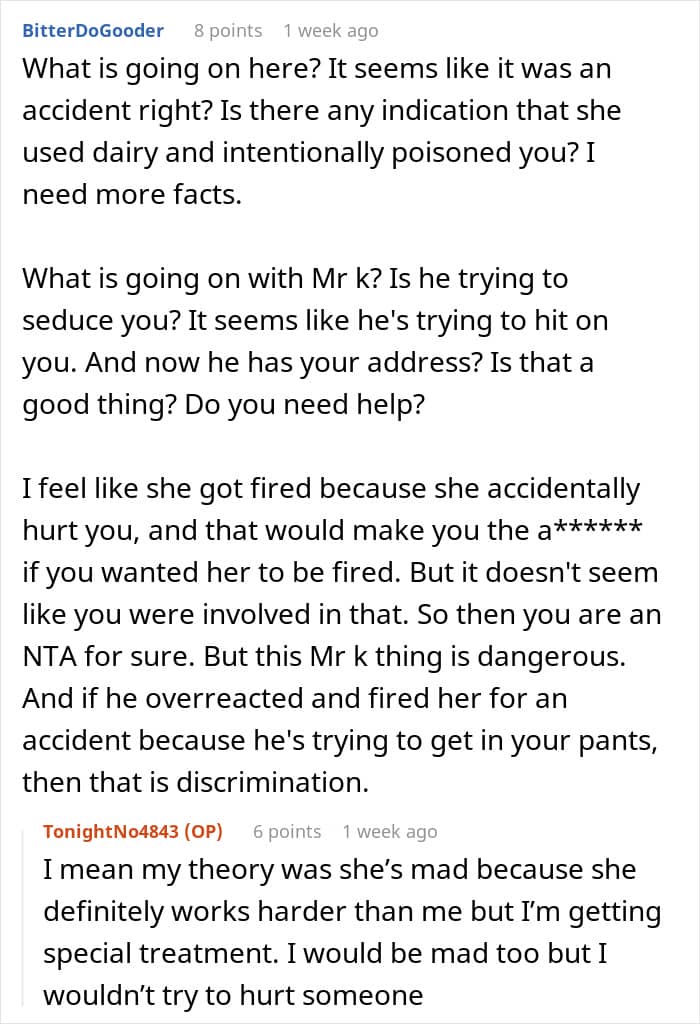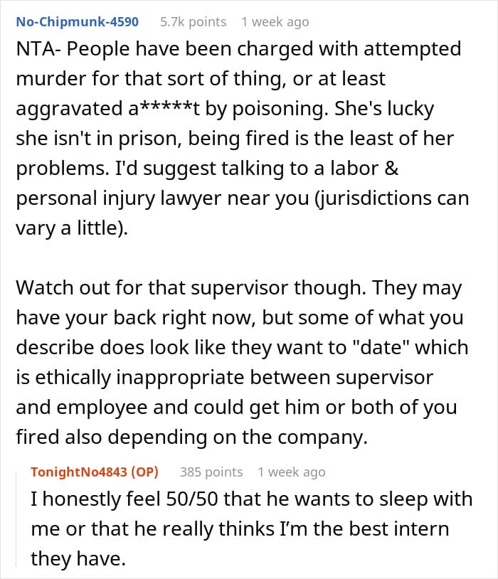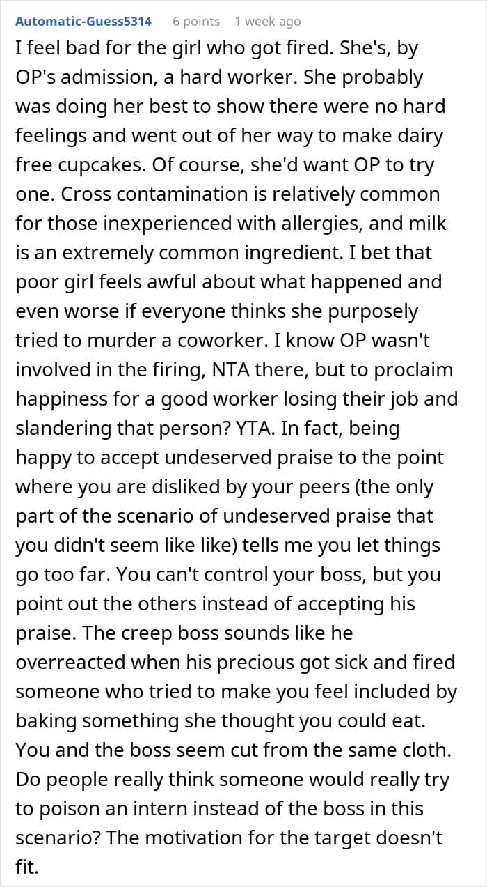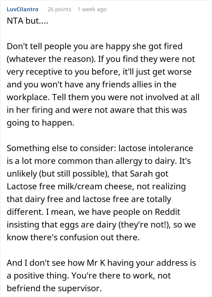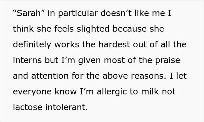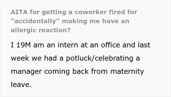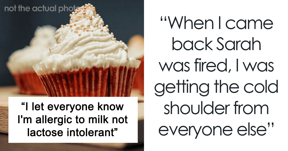 Internet user u/TonightNo4843, who has a serious dairy allergy, shared how he got a fellow intern fired after she allegedly egged him on to try some of the ‘dairy-free’ cupcakes she made for the office. This landed him in the hospital. Check out the full story below. And, to clarify, there is a difference between dairy allergies and lactose intolerance, even if there’s some overlap between the two.