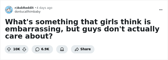 Understandably, these impossible expectations often cause women to develop deep-seated insecurities. But men on Reddit have recently been calling out all of the traits and actions that they want to encourage women to stop being embarrassed by. From tummy rolls to eating in front of others, enjoy scrolling through this list of things that no one should ever feel shame about. And be sure to upvote the replies that hit home for you!