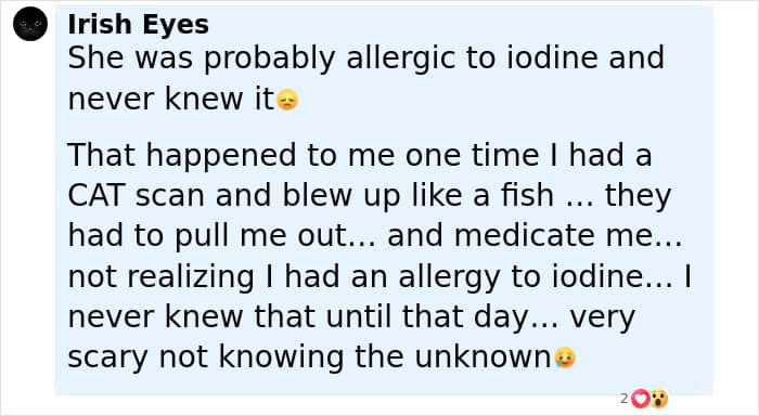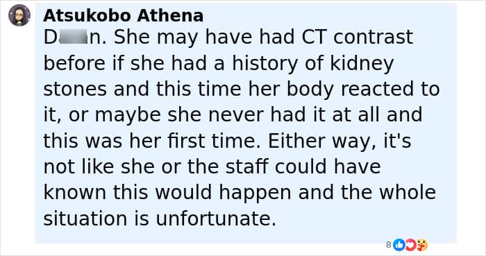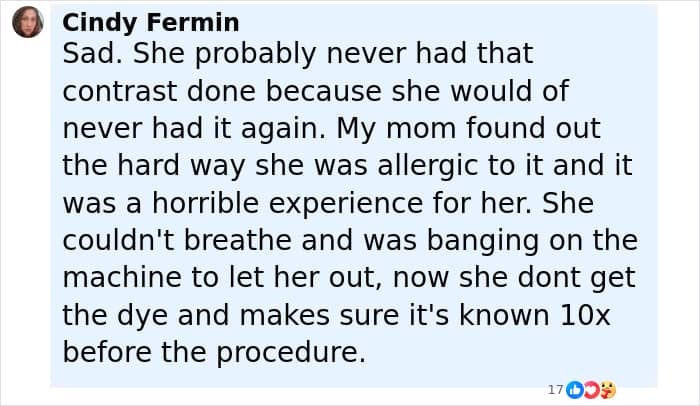 The 22-year-old started showing symptoms almost immediately after being injected with contrast dye during the scan. Desperate, the medical team intubated her but the damage was already done.