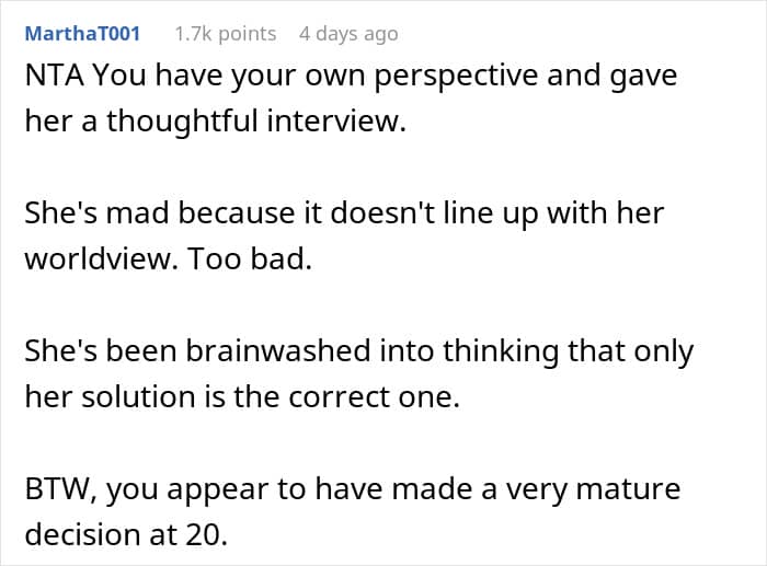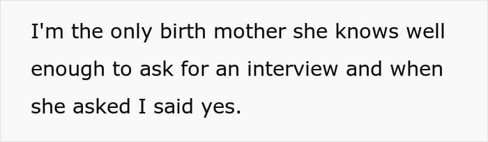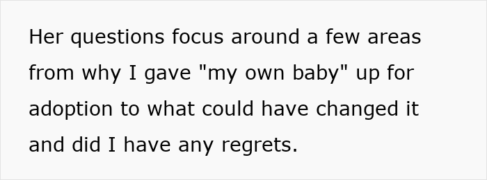 One birth mother has opened up about why she chose not to raise her “own baby” when she gave birth at the age of 20. She was being interviewed by her sister-in-law who is studying to be a social worker. But the interview took a surprising turn when her SIL got angry with her for being honest. Now, she’s wondering whether she should have declined the interview altogether.