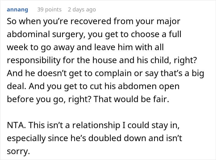 One Redditor learned this the hard way when her partner decided to go on a vacation while she was home alone with a newborn baby, recovering from surgery.