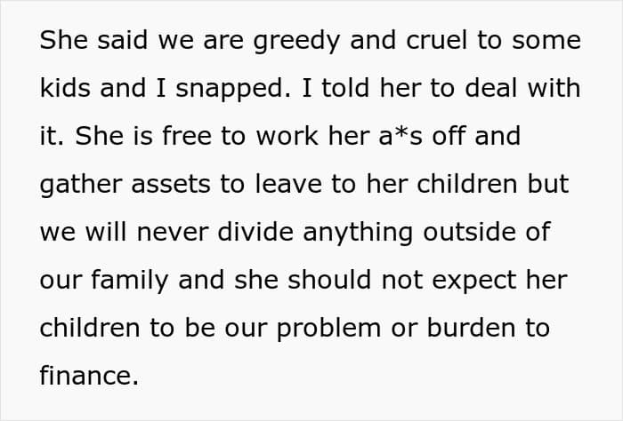 The fiancée called the family greedy and cruel, which caused the OP to snap. She then told the fiancée point-blank that she was welcome to earn her own assets for her children, but the family’s fortune wouldn’t be open to them. The brother tried to de-escalate things, but his fiancée wasn’t ready to drop it.