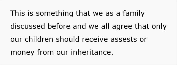 According to the OP, the entire family had long agreed on this rule. To them, inheritance should stay strictly within the bloodline, and while they’re cordial with the fiancée and her children, that doesn’t automatically earn them a slice of the family pie.