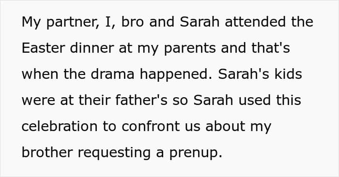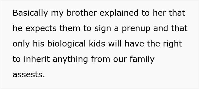 The author started by explaining that her brother’s fiancée had two kids from her previous marriage, but they were going to sign a prenup for only his biological kids to inherit anything