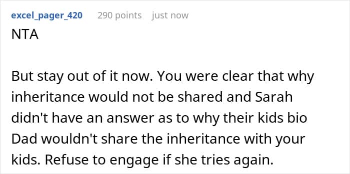 Netizens were divided on the situation, but most sided with the OP. While a few felt the OP should’ve stayed out of her brother’s business, many agreed that the fiancée overstepped by pushing for entitlements her kids weren’t owed. They also emphasized that inheritance is often bloodline-bound, and the prenup is a necessary move to protect that.