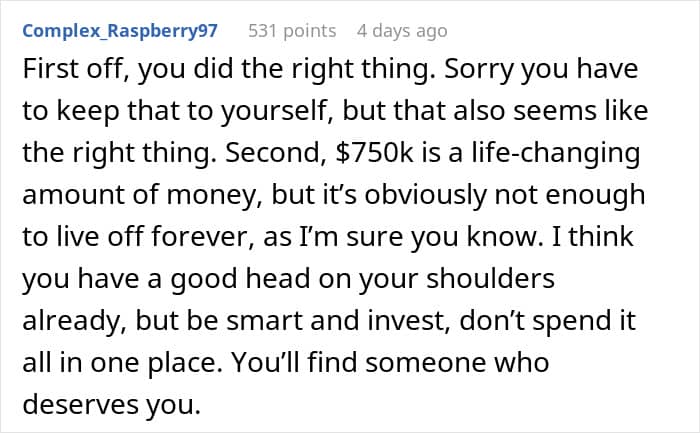 The boyfriend shared their story about how he won a bet and earned $750k. After such luck, the girlfriend started acting strangely, implying that she was now rich and “set for life.” Unsettled by such talk, the BF made a surprising decision but decided to keep it from his family and friends.