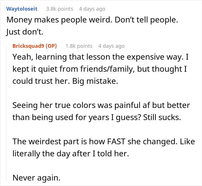 Astle often recommends that his clients keep relationships and money separate. “You never want to question whether the relationship is about safety and genuine enjoyment or if it is just a ploy for money. That can really mess with our brains.” Perhaps the OP in this story did the right thing when he decided to keep his winning to himself.