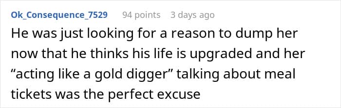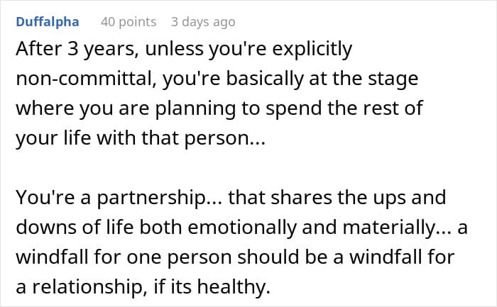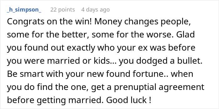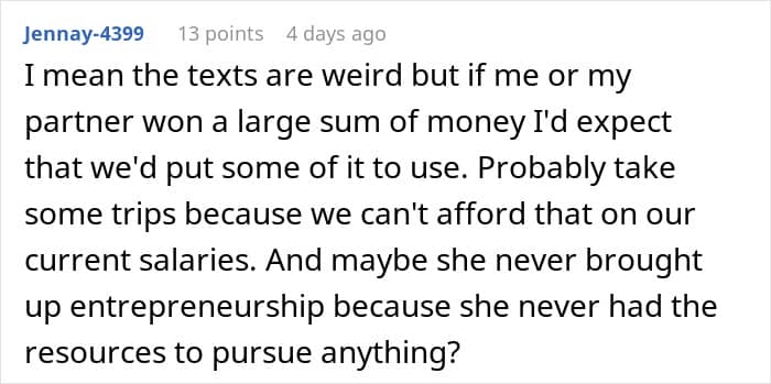 Of course, a sudden windfall doesn’t equal regular earnings. The author of this story doesn’t detail how much he was earning before the winning bet. Still, for the girlfriend to expect to now be “set for life” definitely reveals a thing or two about her priorities.
