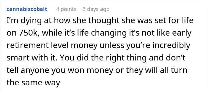 Some commenters agreed that it’s best to keep any sudden wins to yourself: “Money changes people”