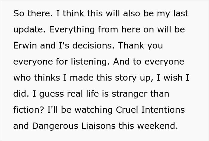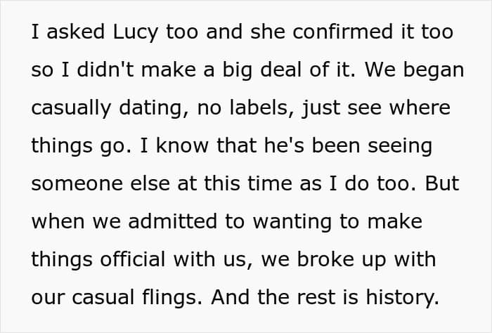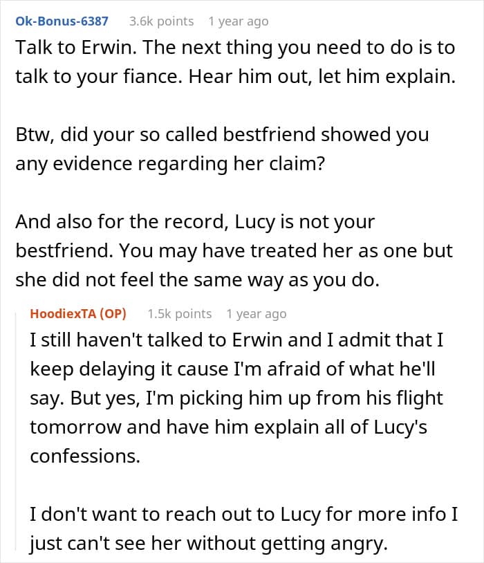 By the way, the original poster also admits that she found out that Lucy called her fiancé several times before the wedding announcement, but he didn’t answer the calls. Perhaps this was the reason for her to tell everything. Whatever the case, everything here seemed to end well. “Everything from here on will be Erwin’s and my decisions,” the author concludes. Now what do you, our dear readers, think about this story?
