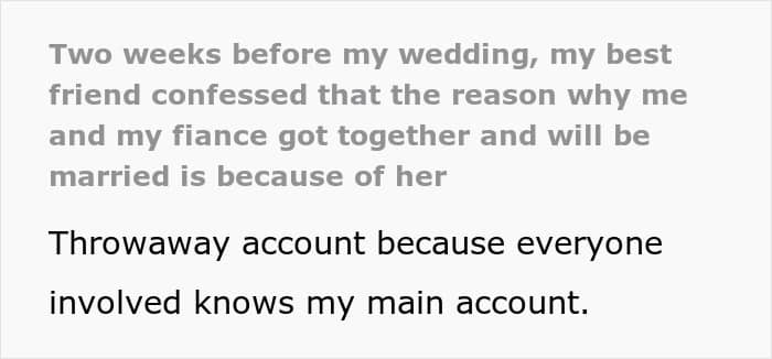 The story we’re going to tell you today, from the user u/HoodiexTA, happened a couple of weeks before her wedding. Her best friend’s attempt to “open the bride’s eyes to her future husband” actually put her in a dilemma: to choose between a 3-year relationship or an 11-year friendship. Because, as it often happens, there’s no third option.