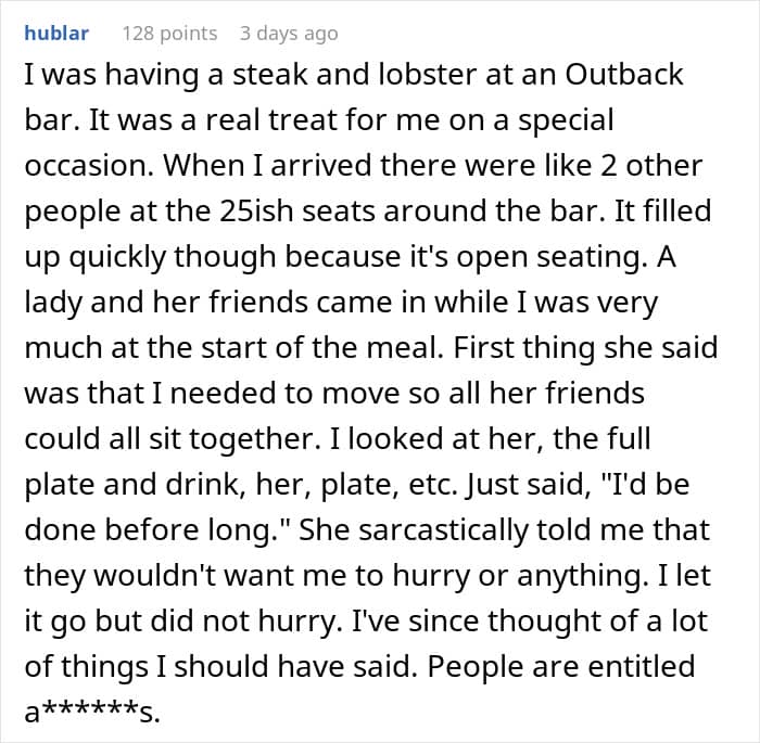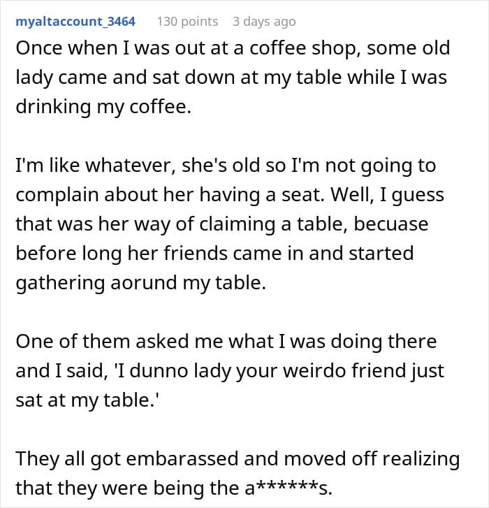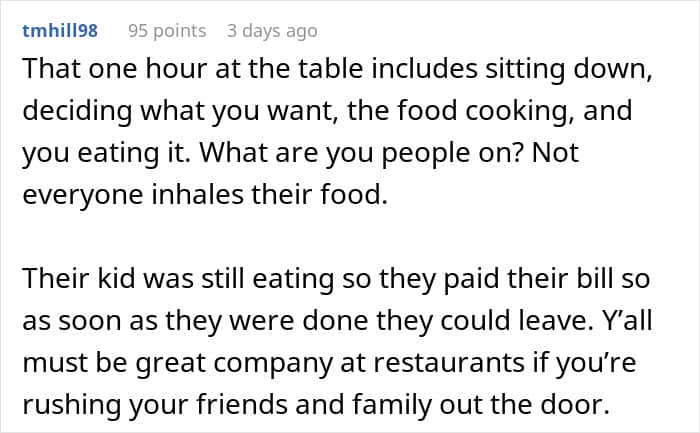 It’s even more wild that some people in the comments defended the madwoman. They flipped the story on the writer and her family, saying that she is the entitled one for taking one WHOLE hour to finish breakfast and calmly sip on their coffee.