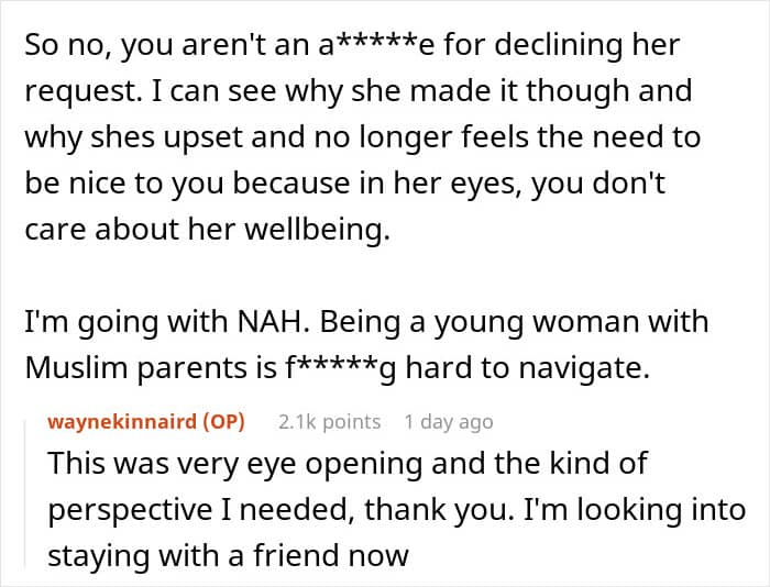 Perhaps the commenters who suggested the roommate show “Sana” some grace and concede were on to something. Having strictly religious parents in modern societies can be harder than those who are religiously unaffiliated imagine. As one commenter wrote, perhaps she’s just navigating how not to lose her family.