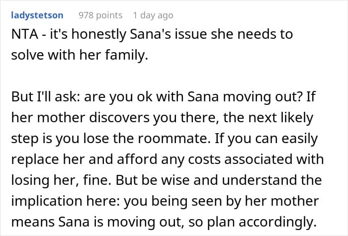 Some commenters pleaded the roommate to be understanding: “She’s trying to break away from a very controlling upbringing”