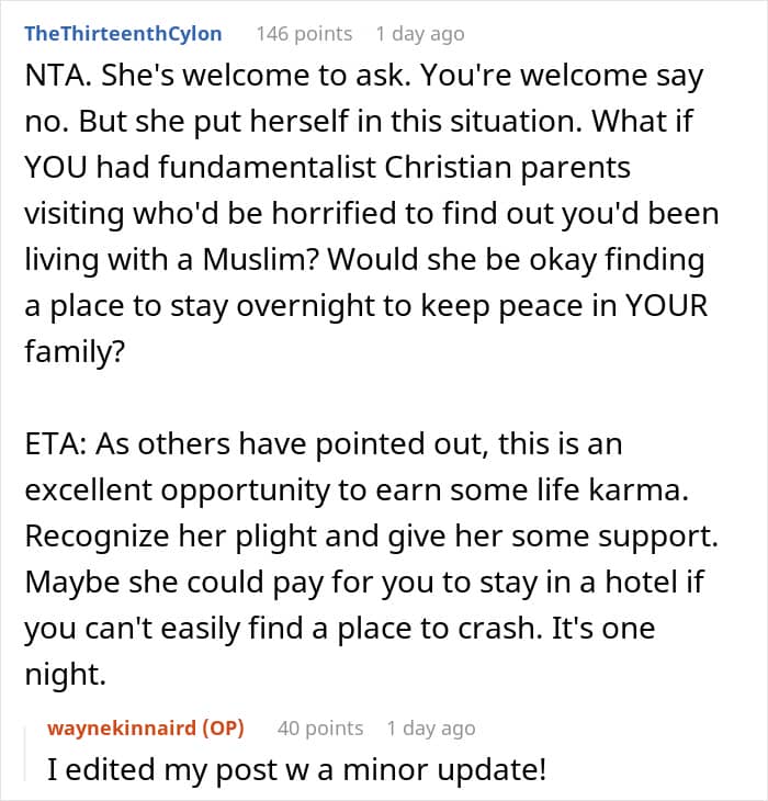 RELATED:A Muslim roommate asked a guy to leave for one night because her conservative mother was visiting