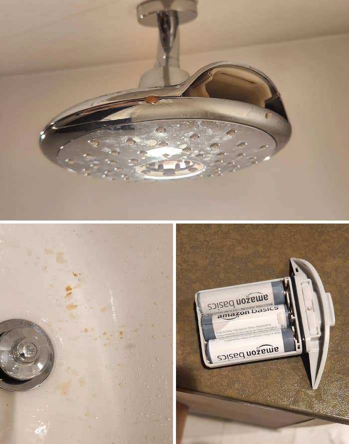 Checked in to my fair field hotel after work took a shower wanted to change the water coming out the shower head to a jet messed around with it couldn’t get it to changed noticed a button looking thing pressed an out pops a battery pack… im like wtf the batteries are all gross and the turn the shower head an out comes a cup of rust water. What is going on… reporting to front desk.