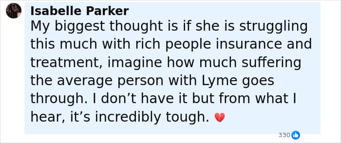 “Hopefully soon I will share whatever we have learned and the places we have been with you and our Lyme community as soon as lab results reflect our victory,” she went on to say.