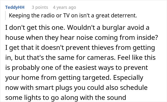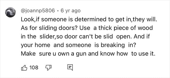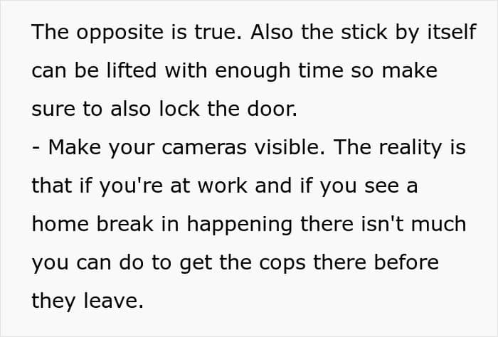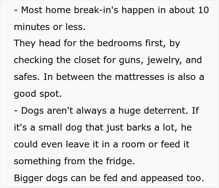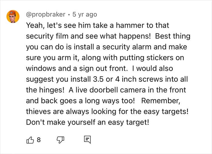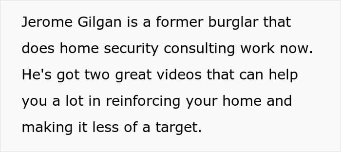 An ex-burglar shared his tips for what someone can do to deter other thieves. From ways to strengthen your doors, to things that might deter burglars, get comfortable as you scroll through, upvote the most interesting ideas and be sure to leave your thoughts in the comments section below.
