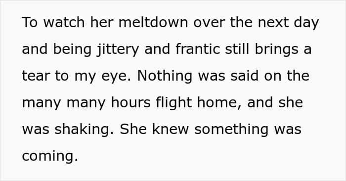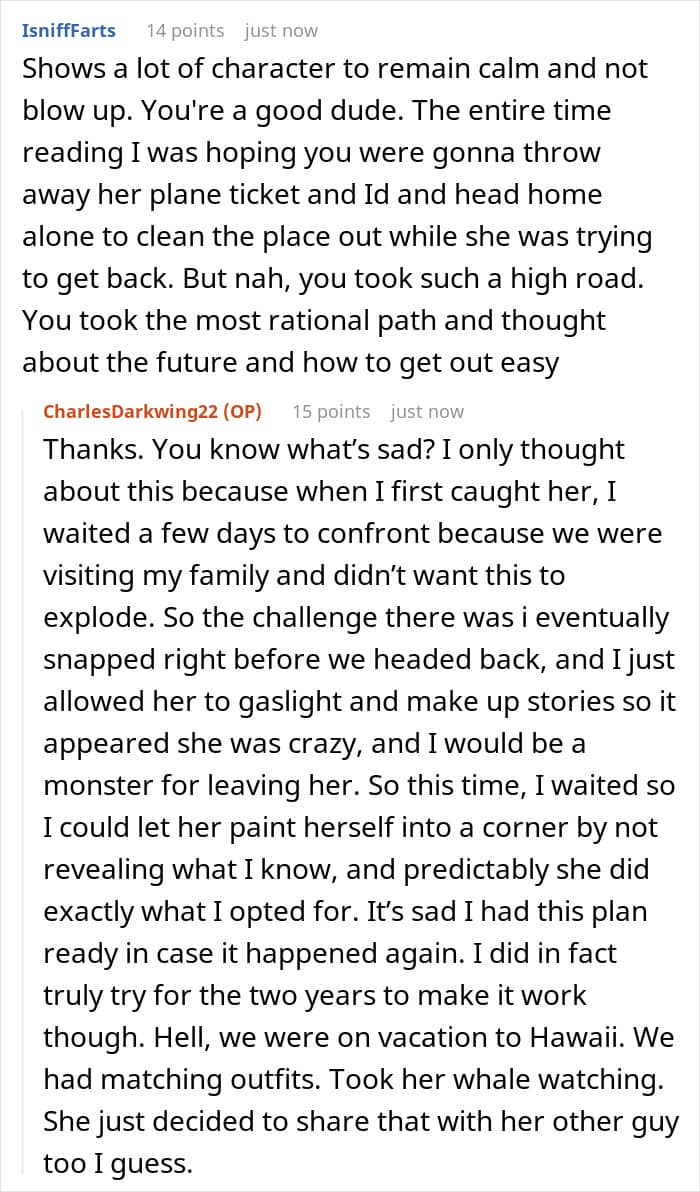 He purposefully deleted the text thread and blocked the contact. This caused the cheater likely the most anxious 24 hours of her life, as she had to “enjoy” the flight home knowing that something was definitely up but being unable to confront her husband about it as that would have exposed her.