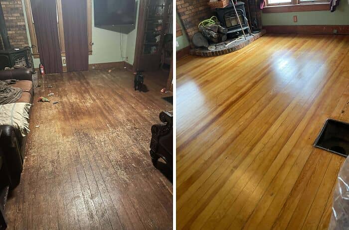 #13 Don’t Know If This Belongs On This Sub. The Previous Owners Of Our 1918 Home Put A Cheap Ugly Finish On The Floors. Second Photo Is The Refinished Result