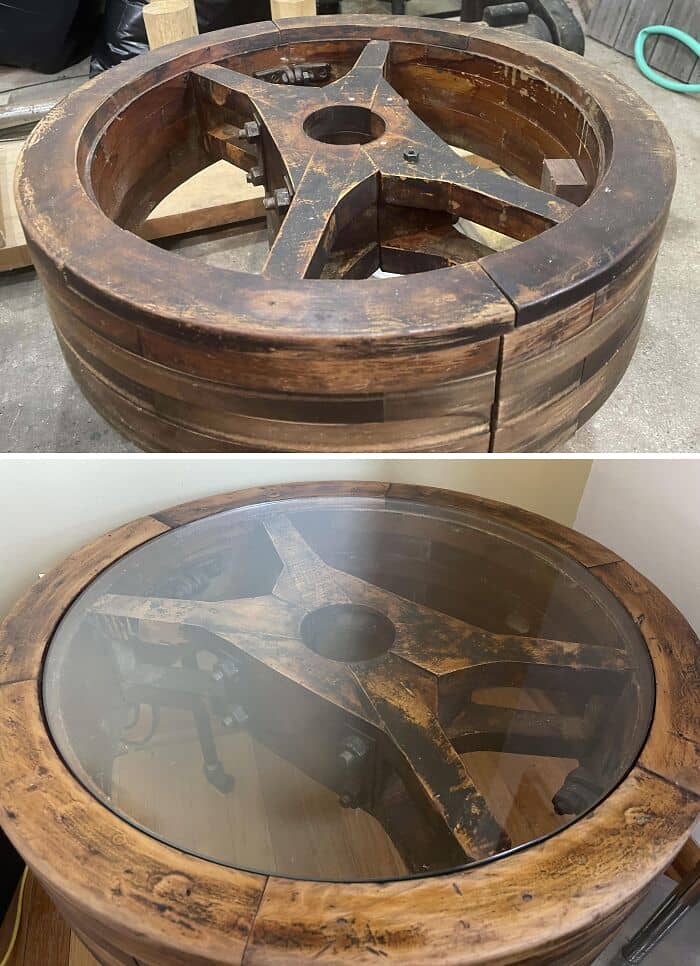 In 1963, my grandfather acquired some of these giant flywheels that were in an old factory that used the current from a stream to turn their spindle machines. They sat in his garage for decades until his passing. In 2021 they made their way to me and the other day I turned one of them into a table. Had to router out about 1/8″ of the beveled inside edge to make the glass fit. Pretty happy with the way it cleaned up.