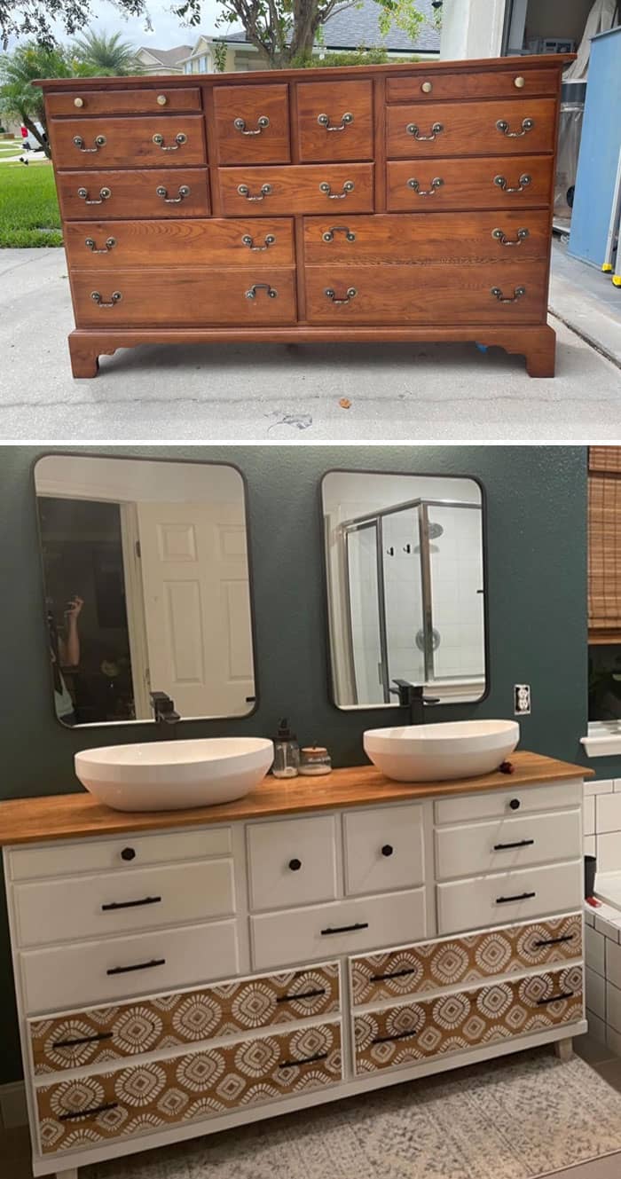 #117 Flipped This Solid Wood Dresser From Goodwill Into A Vanity For Our Bathroom! Before And After