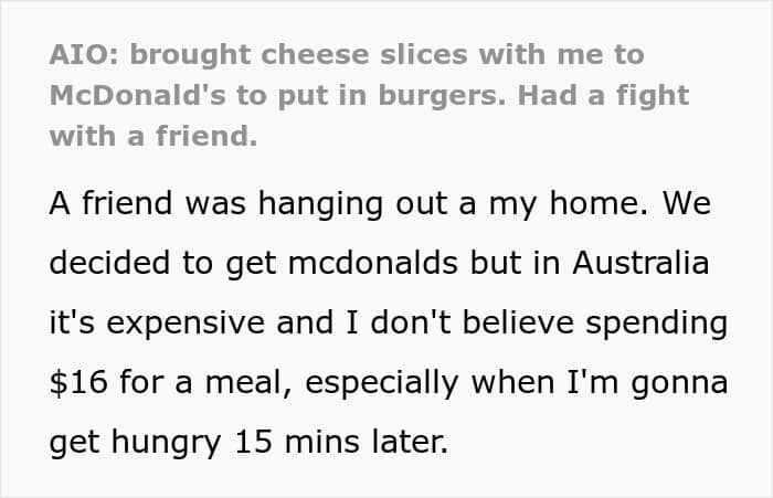 How we spend our money is none of other people’s business. But when Reddit user Salty_lake_222 went to McDonald’s with their friend, the two of them got into an argument over a couple of cheese slices.