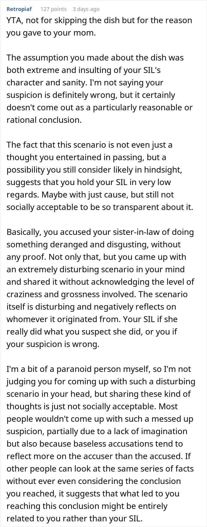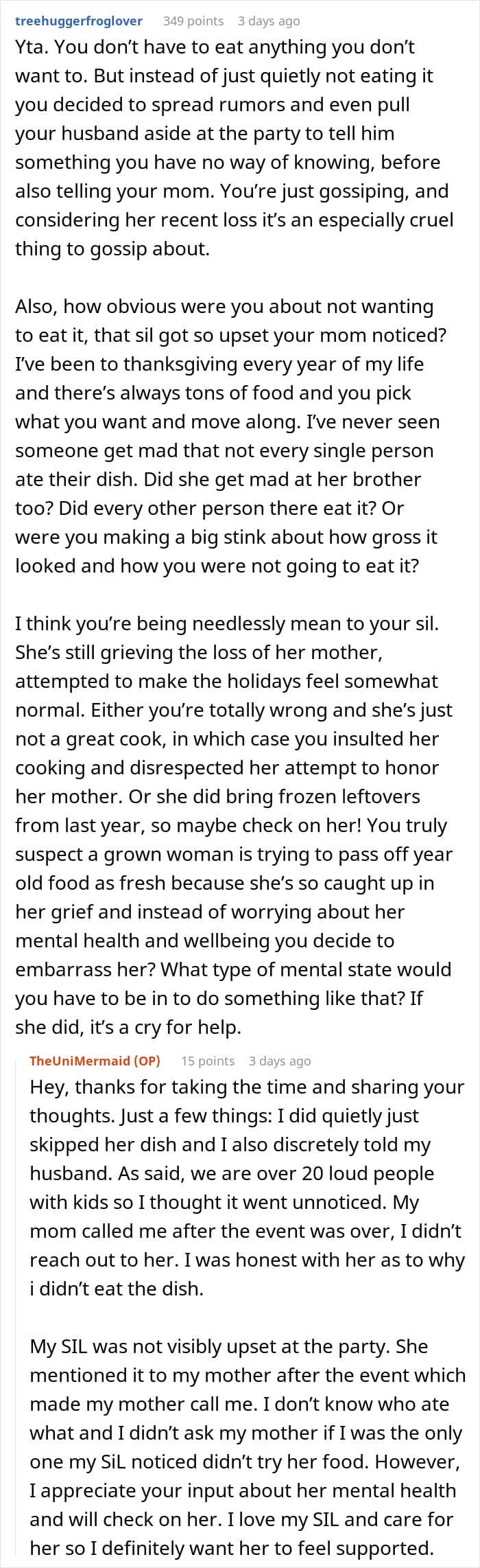 The sister-in-law’s mother passed away fairly recently, and the sweet potato casserole was a tribute. The author’s comments likely triggered her, compounding her grief.